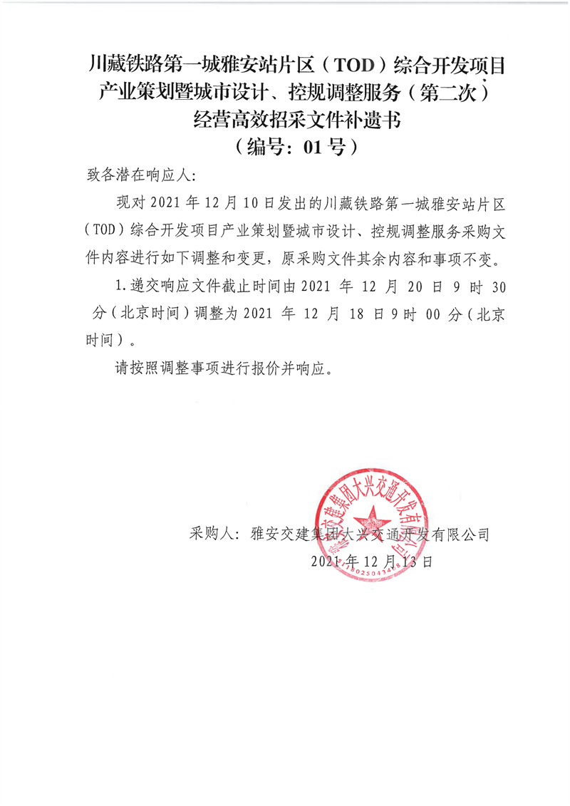 雅安交建集團(tuán)大興交通開發(fā)有限公司川藏鐵路第一城雅安站片區(qū)(TOD)綜合開發(fā)項(xiàng)目產(chǎn)業(yè)策劃暨城市設(shè)計、控規(guī)調(diào)整服務(wù)(第二次)經(jīng)營高效招采文件補(bǔ)遺書(編號:01號)