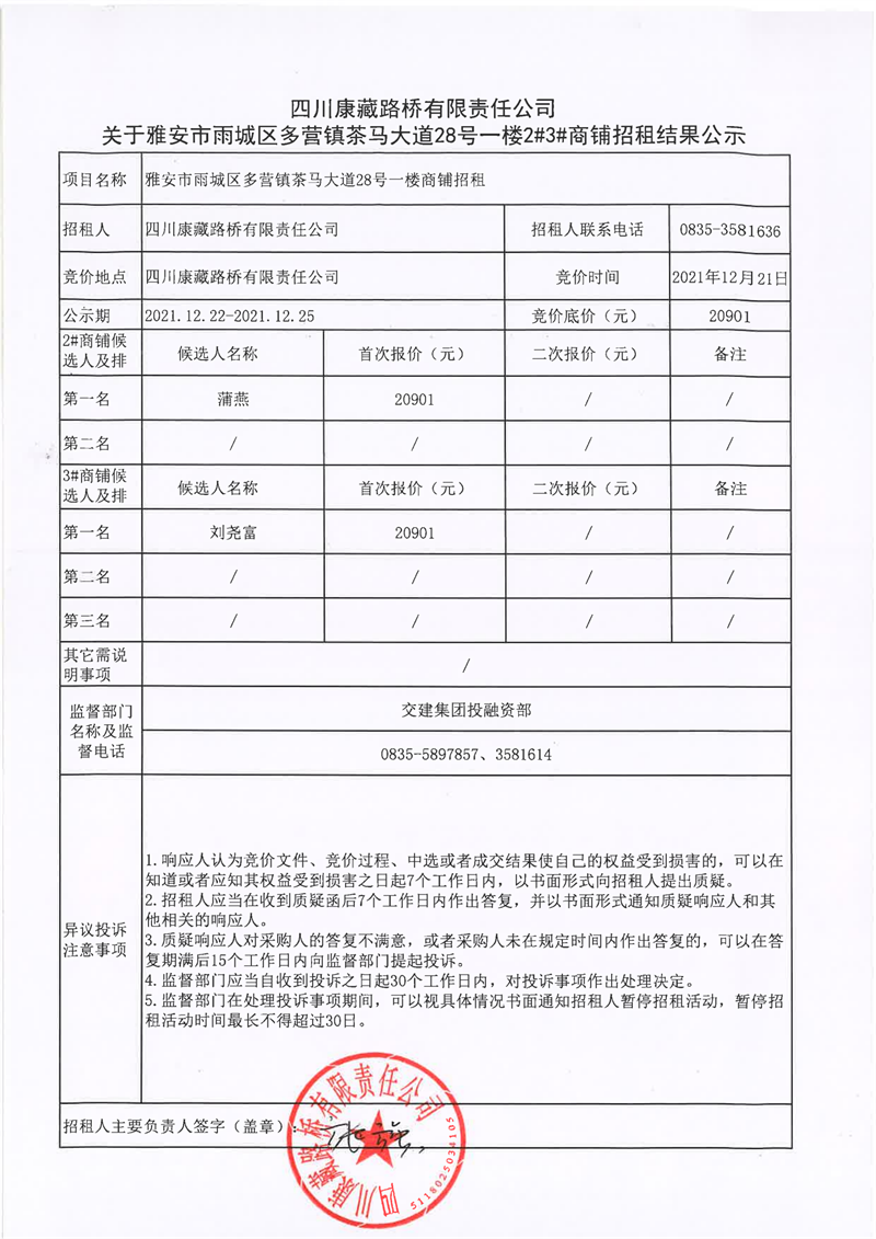 四川康藏路橋有限責(zé)任公司關(guān)于雅安市雨城區(qū)多營鎮(zhèn)茶馬大道28號(hào)一樓2#3#商鋪招租結(jié)果公示