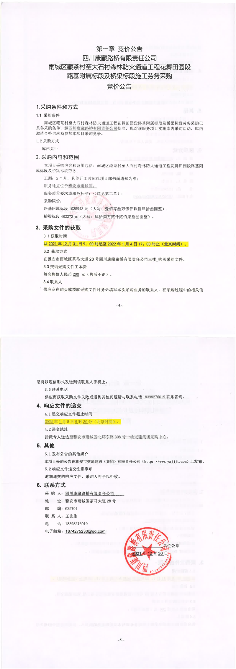 四川康藏路橋有限責(zé)任公司雨城區(qū)藏茶村至大石村森林防火通道工程花舞田園段路基附屬標(biāo)段及橋梁標(biāo)段施工勞務(wù)采購(gòu)競(jìng)價(jià)公告