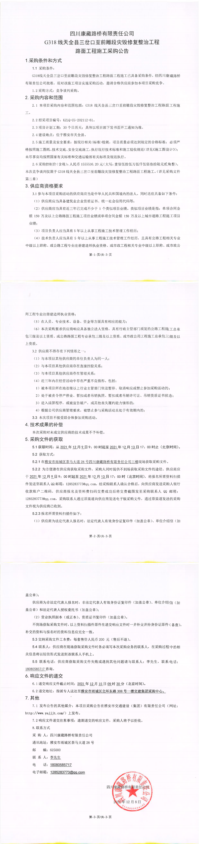 四川康藏路橋有限責任公司G318線天全縣三岔口至前雕段災毀修復整治工程路面工程施工采購公告