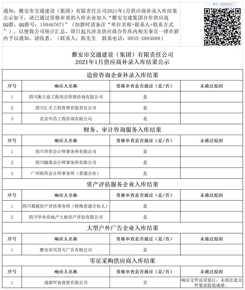 雅安市交通建設(shè)(集團(tuán))有限責(zé)任公司2021年1月供應(yīng)商補(bǔ)錄入庫結(jié)果公示
