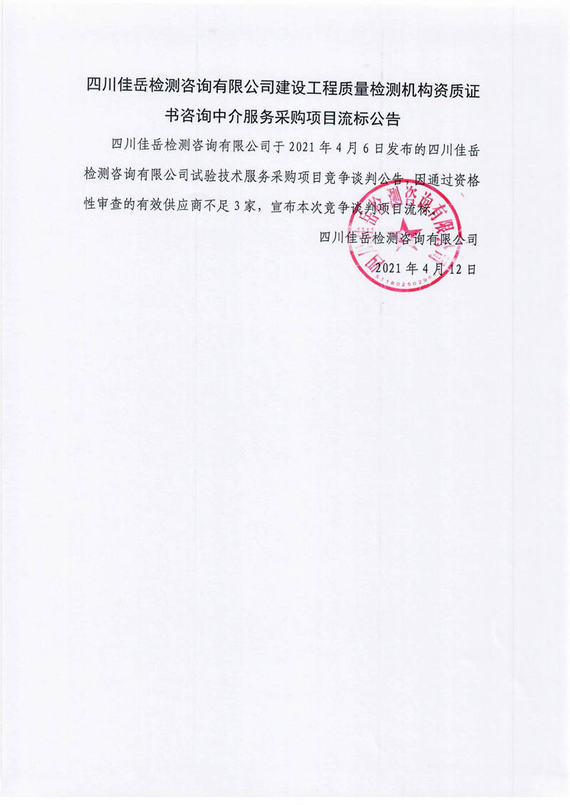 四川佳岳檢測(cè)咨詢有限公司建設(shè)工程質(zhì)量檢測(cè)機(jī)構(gòu)資質(zhì)證書咨詢中介服務(wù)采購(gòu)項(xiàng)目流標(biāo)公告