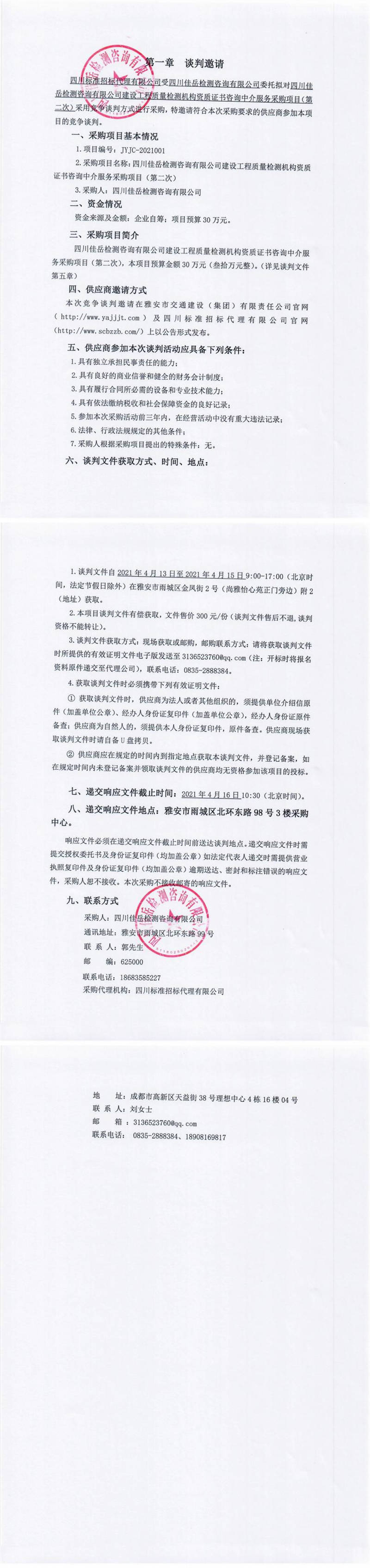 四川佳岳檢測咨詢有限公司建設(shè)工程質(zhì)量檢測機構(gòu)資質(zhì)證書咨詢中介服務(wù)采購項目(第二次)競爭談判公告