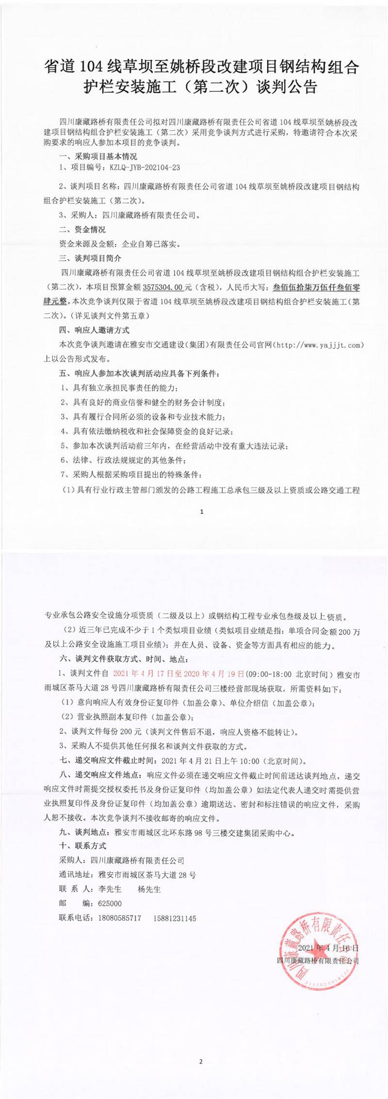四川康藏路橋有限責(zé)任公司省道104線草壩至姚橋段改建項目鋼結(jié)構(gòu)組合護(hù)欄安裝施工(第二次)談判公告