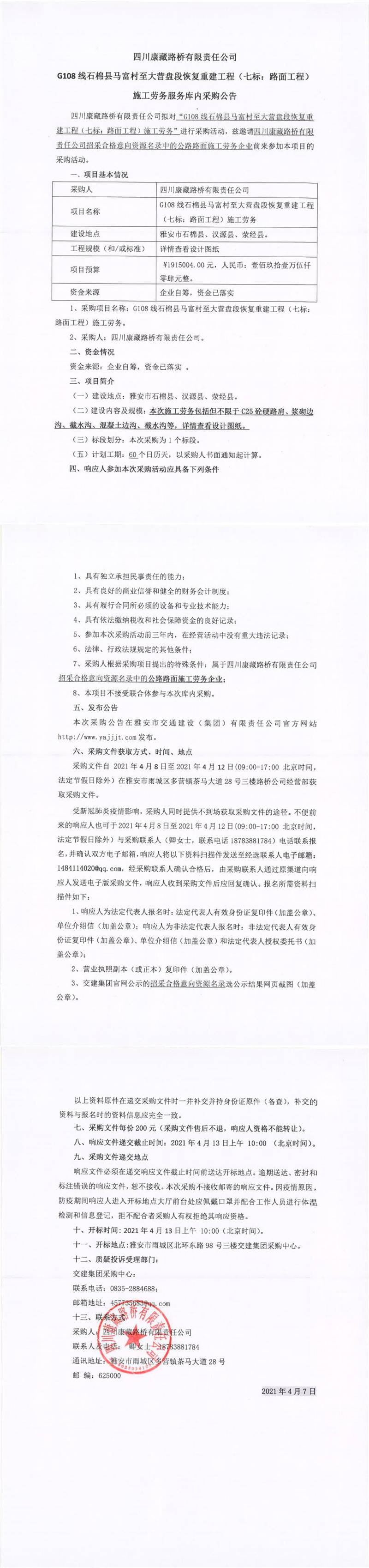 四川康藏路橋有限責(zé)任公司G108線石棉縣馬富村至大營(yíng)盤(pán)段恢復(fù)重建工程(七標(biāo):路面工程)施工勞務(wù)服務(wù)庫(kù)內(nèi)采購(gòu)公告