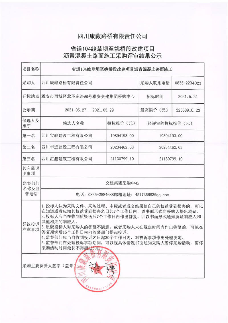 四川康藏路橋有限責(zé)任公司省道104線草壩至姚橋改建項(xiàng)目瀝青混凝土路面施工采購評審結(jié)果公示