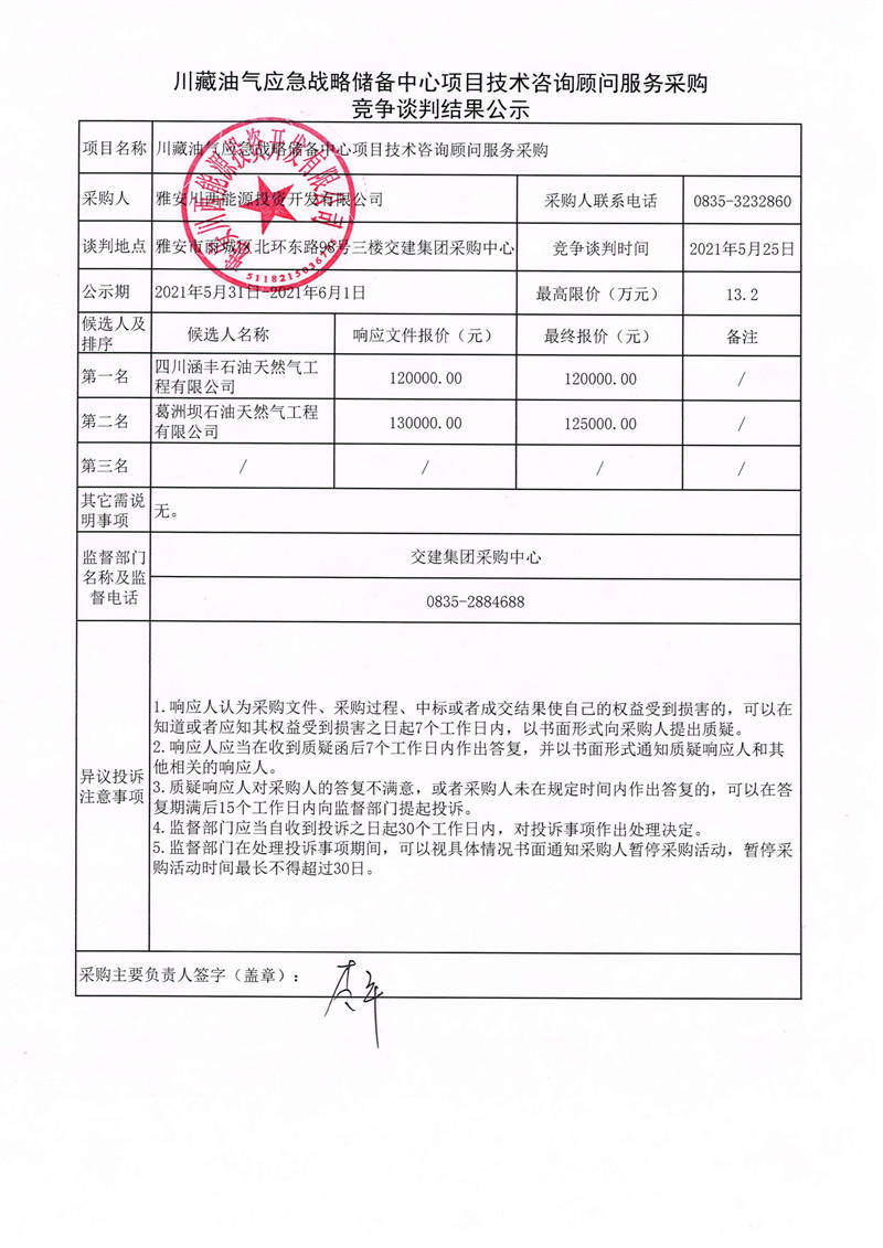 雅安川西能源投資開(kāi)發(fā)有限公司川藏油氣應(yīng)急戰(zhàn)略?xún)?chǔ)備中心項(xiàng)目技術(shù)咨詢(xún)顧問(wèn)服務(wù)采購(gòu)競(jìng)爭(zhēng)談判結(jié)果公示