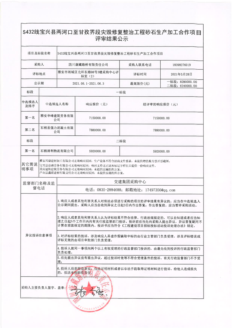 四川康藏路橋有限責(zé)任公司S432線寶興縣兩河口至甘孜界段災(zāi)毀修復(fù)整治工程砂石生產(chǎn)加工合作項(xiàng)目評審結(jié)果公示