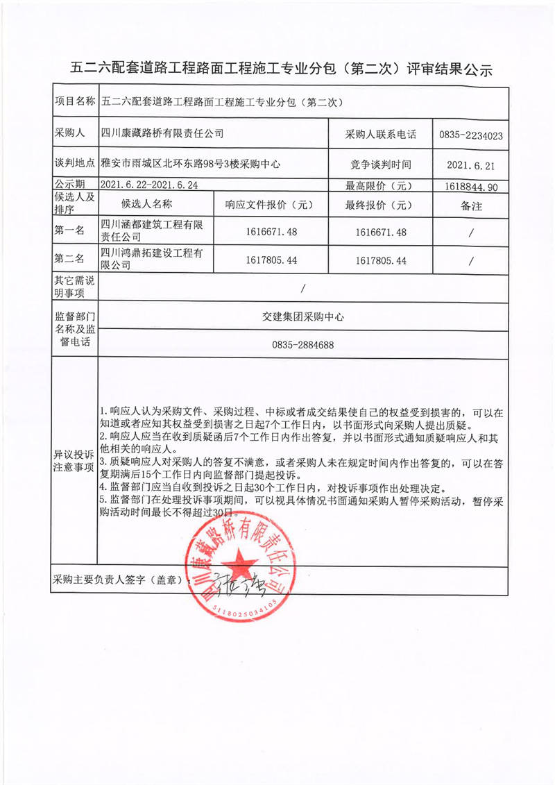 四川康藏路橋有限責(zé)任公司五二六配套道路工程路面工程施工專業(yè)分包(第二次)評審結(jié)果公示
