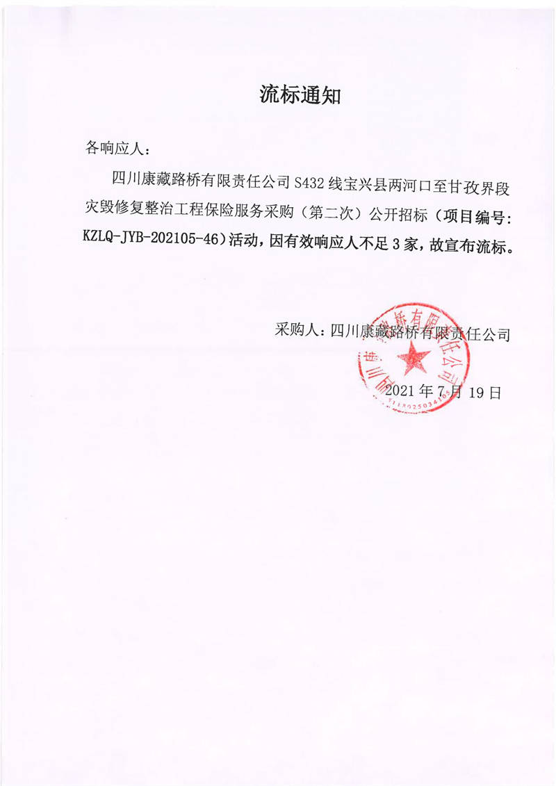 四川康藏路橋有限責(zé)任公司S432線寶興縣兩河口至甘孜界段災(zāi)毀修復(fù)整治工程保險服務(wù)采購(第二次)流標(biāo)通知