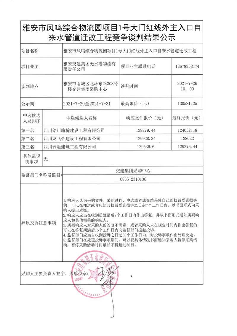 雅安交建集團無水港物流有限責任公司雅安市鳳鳴綜合物流園項目1號大門紅線外主入口自來水管道遷改工程競爭談判結果公示