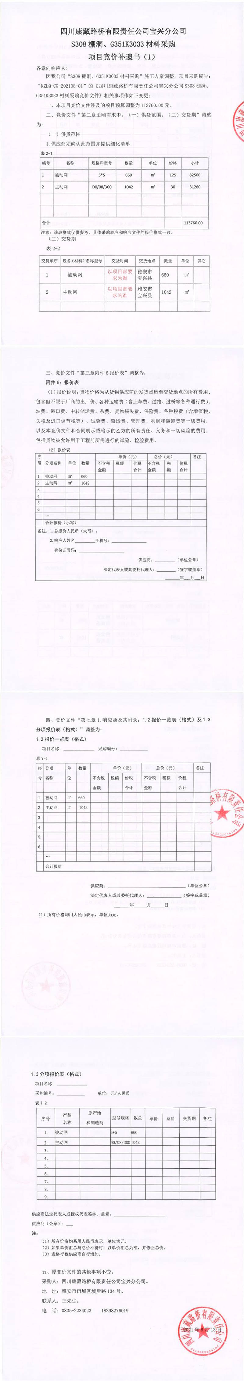四川康藏路橋有限責(zé)任公司寶興分公司S308棚洞、G351K3033材料采購項目競價補遺書(1)