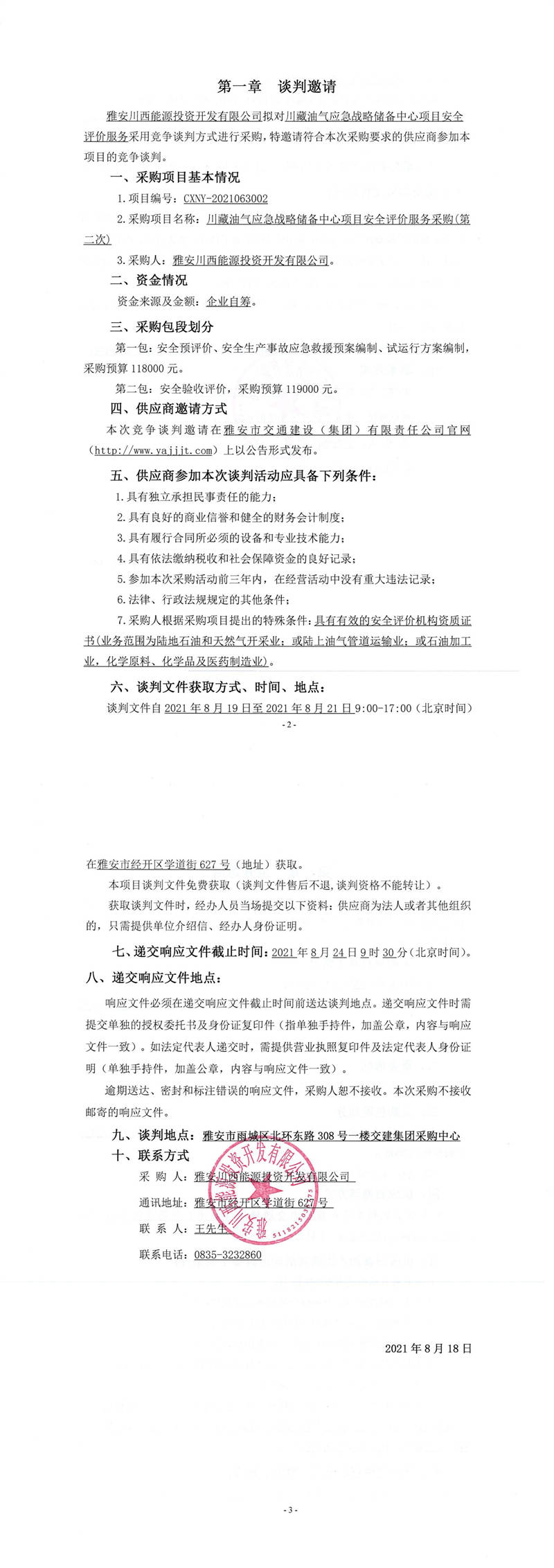 雅安川西能源投資開發(fā)有限公司川藏油氣應(yīng)急戰(zhàn)略儲備中心項目安全評價服務(wù)采購(第二次)競爭談判公告