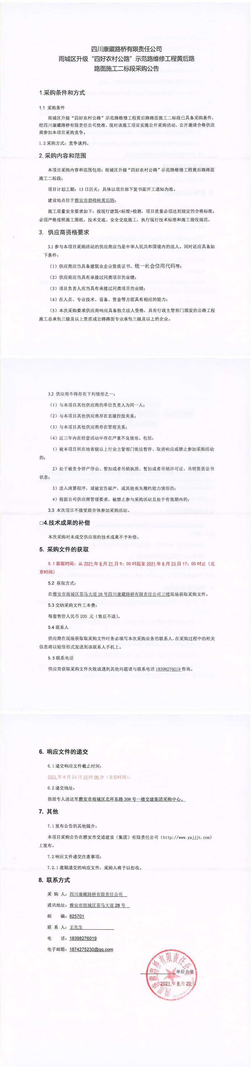 四川康藏路橋有限責(zé)任公司雨城區(qū)升級(jí)“四好農(nóng)村公路”示范路維修工程黃后路路面施工二標(biāo)段采購(gòu)公告