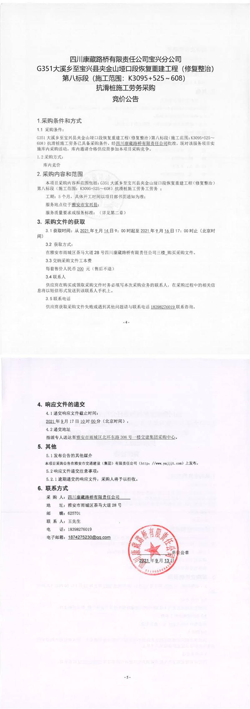 四川康藏路橋有限責(zé)任公司寶興分公司G351大溪鄉(xiāng)至寶興縣夾金山埡口段恢復(fù)重建工程(修復(fù)整治)第八標(biāo)段(施工范圍:K3095+525-608)抗滑樁施工勞務(wù)采購競價公告
