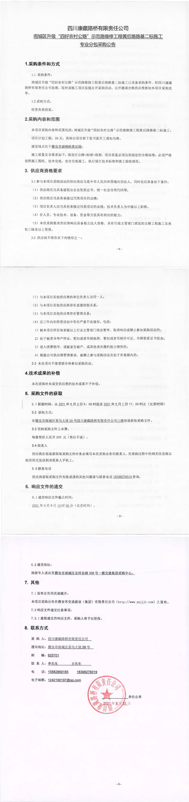 四川康藏路橋有限責(zé)任公司雨城區(qū)升級(jí)“四好農(nóng)村公路”示范路維修工程黃后路路基二標(biāo)施工專業(yè)分包采購公告