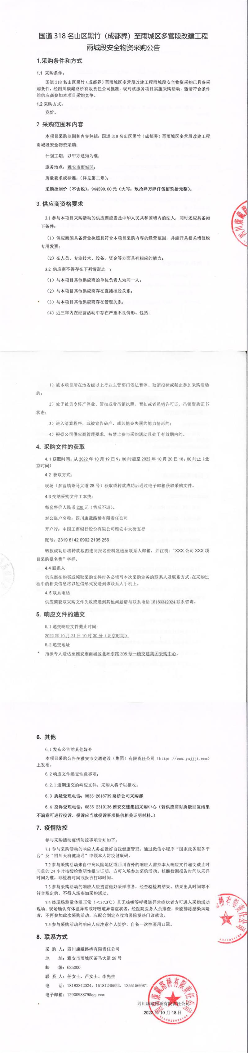 四川康藏路橋有限責(zé)任公司國(guó)道318名山區(qū)黑竹(成都界)至雨城區(qū)多營(yíng)段改建工程雨城段安全物資采購(gòu)公告