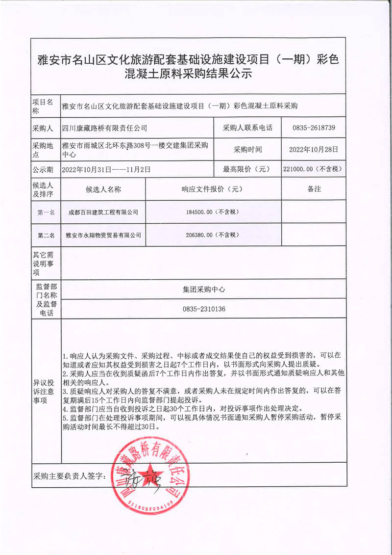 四川康藏路橋有限責(zé)任公司雅安市名山區(qū)文化旅游配套基礎(chǔ)設(shè)施建設(shè)項目(一期)彩色混凝土原料采購結(jié)果公示