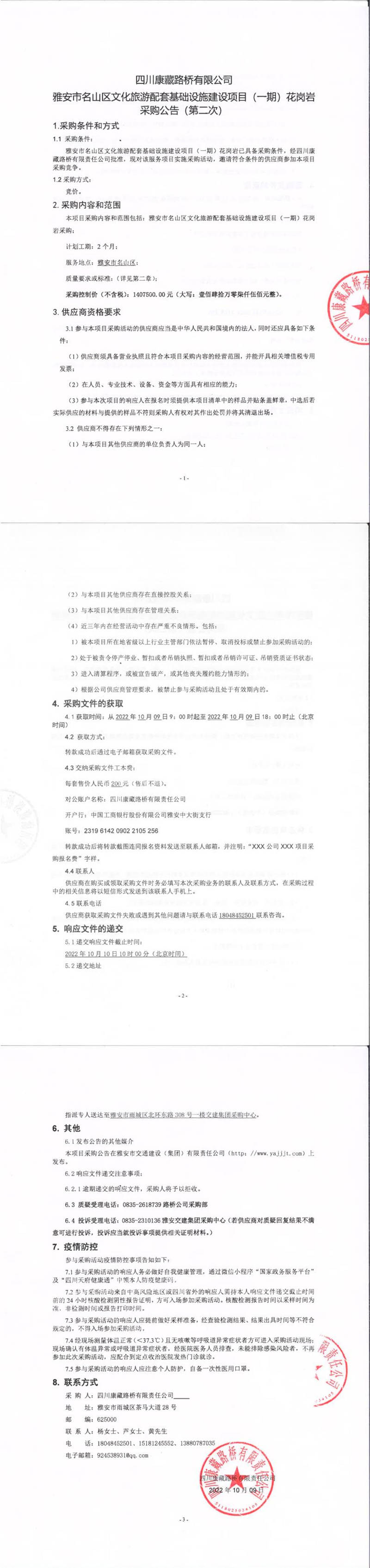 四川康藏路橋有限責(zé)任公司雅安市名山區(qū)文化旅游配套基礎(chǔ)設(shè)施建設(shè)項(xiàng)目(一期)花崗巖采購(gòu)公告(第二次)