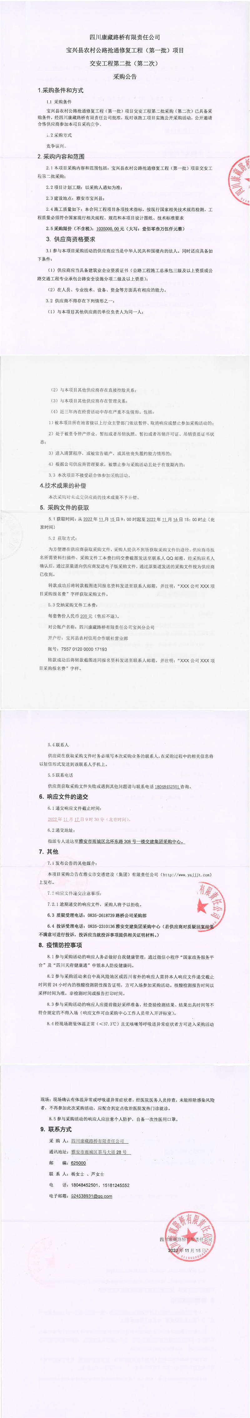 四川康藏路橋有限責(zé)任公司寶興縣農(nóng)村公路搶通修復(fù)工程(第一批)項(xiàng)目交安工程第二批采購(gòu)(第二次)結(jié)果公示