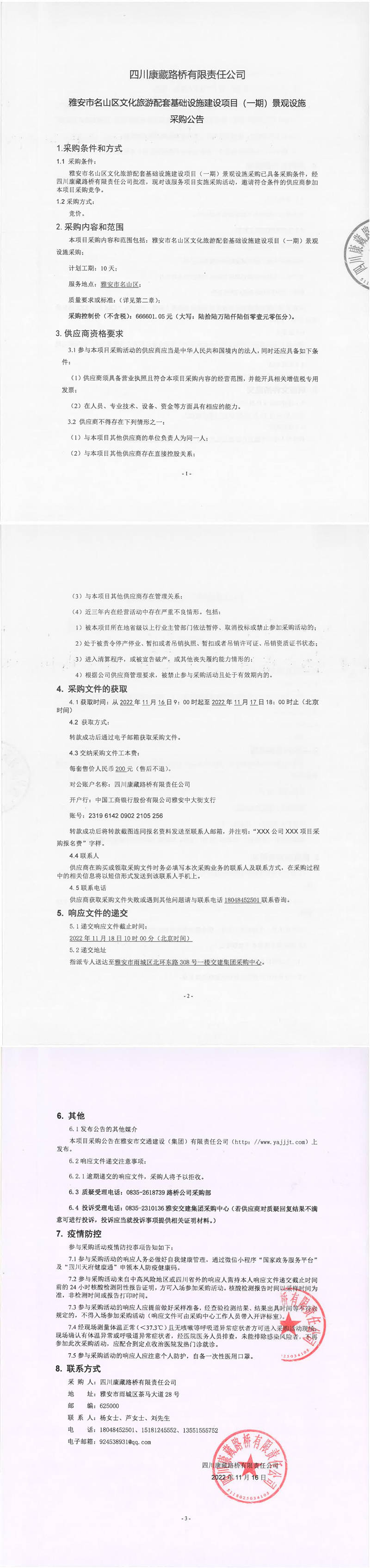 四川康藏路橋有限責(zé)任公司雅安市名山區(qū)文化旅游配套基礎(chǔ)設(shè)施建設(shè)項(xiàng)目(一期)景觀設(shè)施采購公告