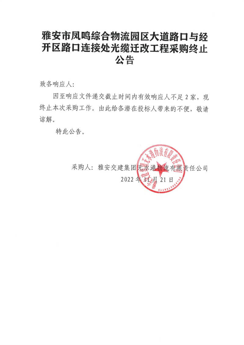 雅安交建集團無水港物流有限責(zé)任公司雅安市鳳鳴綜合物流園區(qū)大道路口與經(jīng)開區(qū)路口連接處光纜遷改工程采購終止公告