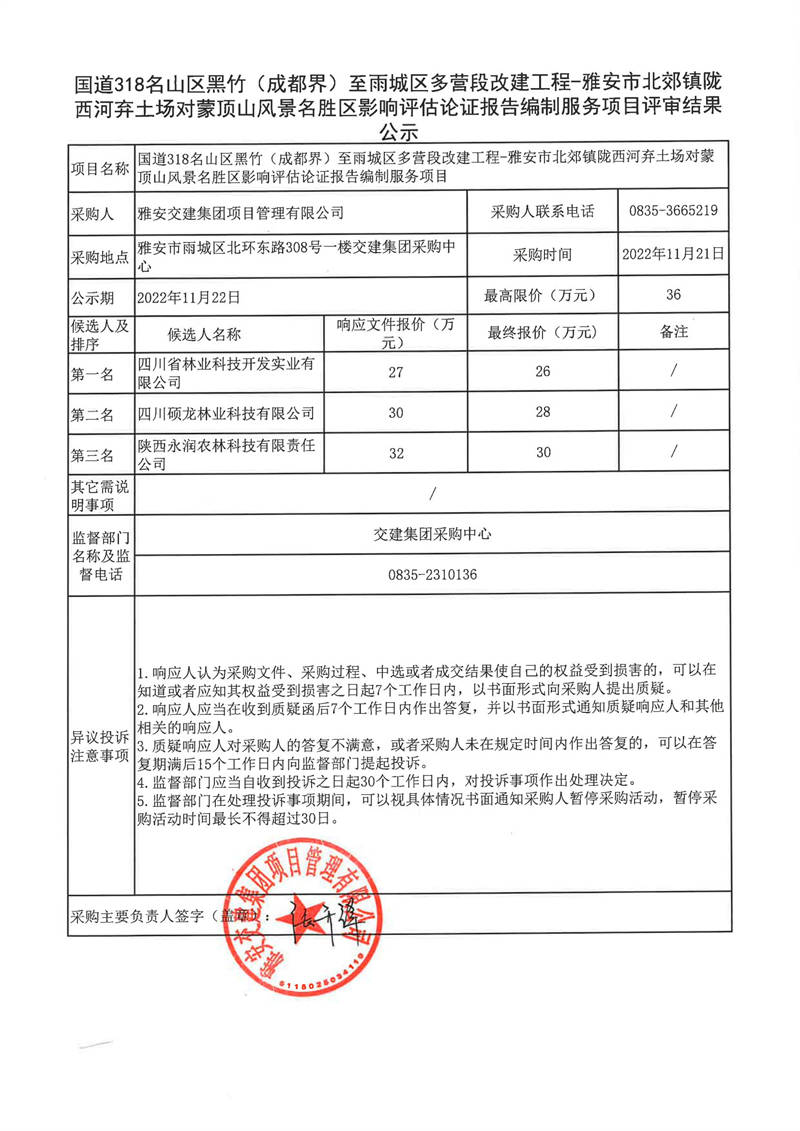 雅安交建集團(tuán)項(xiàng)目管理有限公司國(guó)道318名山區(qū)黑竹(成都界)至雨城區(qū)多營(yíng)段改建工程-雅安市北郊鎮(zhèn)隴西河棄土場(chǎng)對(duì)蒙頂山風(fēng)景名勝區(qū)影響評(píng)估論證報(bào)告編制服務(wù)評(píng)審結(jié)果公示