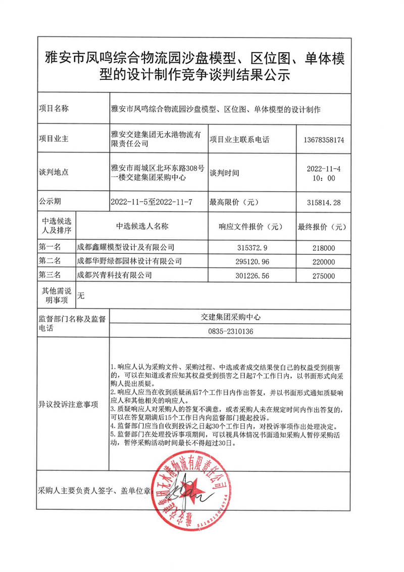 雅安交建集團(tuán)無(wú)水港物流有限責(zé)任公司雅安市鳳鳴綜合物流園沙盤(pán)模型、區(qū)位圖、單體模型的設(shè)計(jì)制作競(jìng)爭(zhēng)談判結(jié)果公示