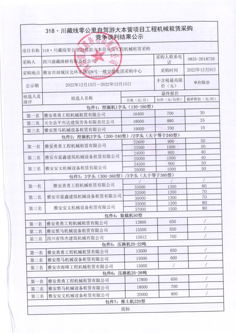 四川康藏路橋有限責(zé)任公司318.川藏線零公里自駕游大本營(yíng)項(xiàng)目工程機(jī)械租賃采購(gòu)競(jìng)爭(zhēng)談判結(jié)果公示