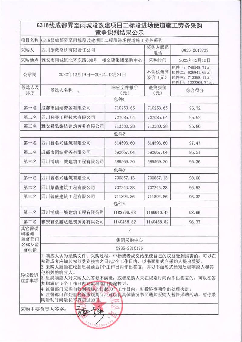 四川康藏路橋有限責(zé)任公司G318線成都界至雨城段改建項(xiàng)目二標(biāo)段進(jìn)場(chǎng)便道施工勞務(wù)采購(gòu)競(jìng)爭(zhēng)談判結(jié)果公示