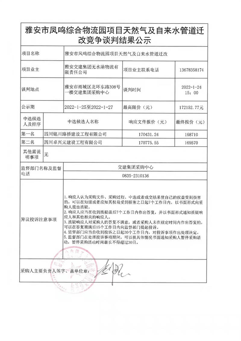 雅安交建集團(tuán)無(wú)水港物流有限責(zé)任公司雅發(fā)市鳳鳴綜合物流園項(xiàng)目天然氣及自來(lái)水管道遷改競(jìng)爭(zhēng)談判結(jié)果公示