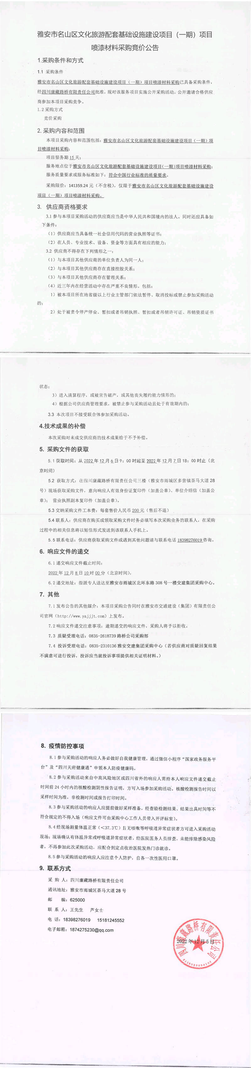 四川康藏路橋有限責任公司雅安市名山區(qū)文化旅游配套基礎(chǔ)設(shè)施建設(shè)項目(一期)項目噴漆材料采購競價公告