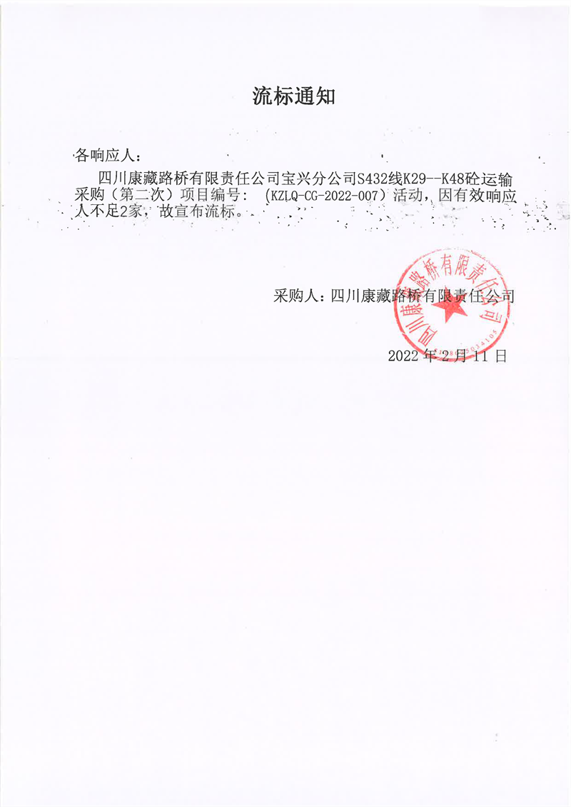 四川康藏路橋有限責(zé)任公司寶興分公司S432線(xiàn)K29-K48砼運(yùn)輸采購(gòu)(第二次)項(xiàng)目流標(biāo)通知