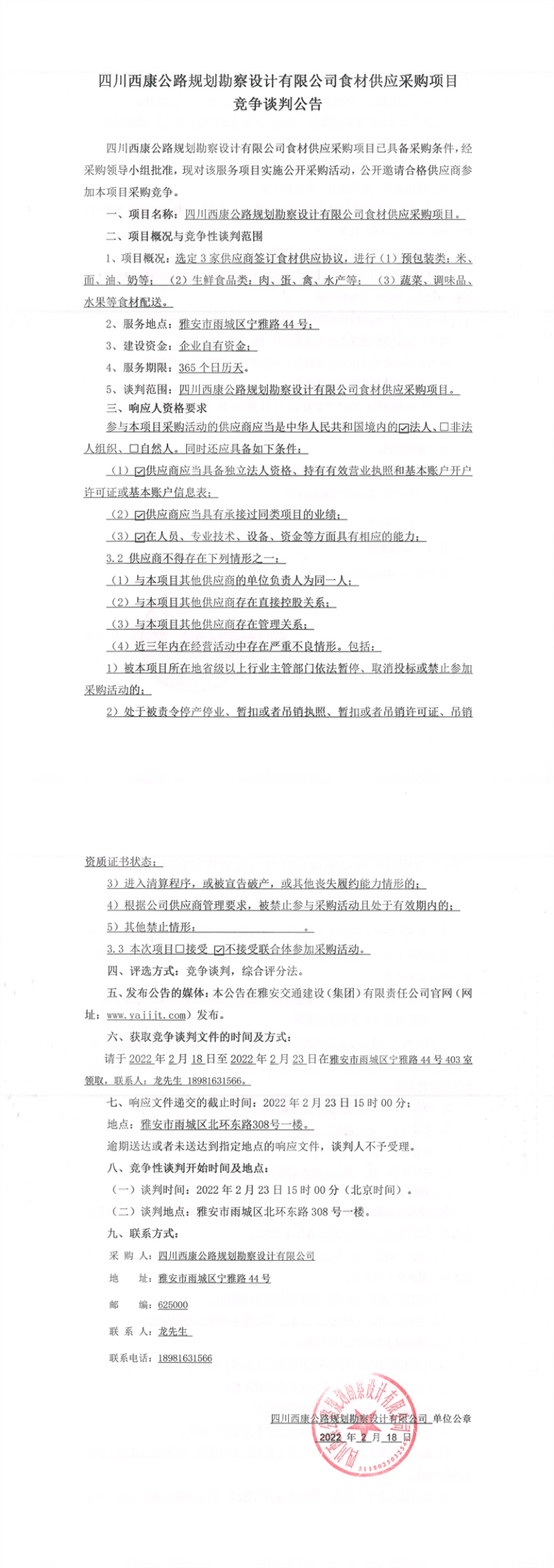 四川西康公路規(guī)劃勘察設(shè)計(jì)有限公司食材供應(yīng)采購項(xiàng)目競爭談判公告