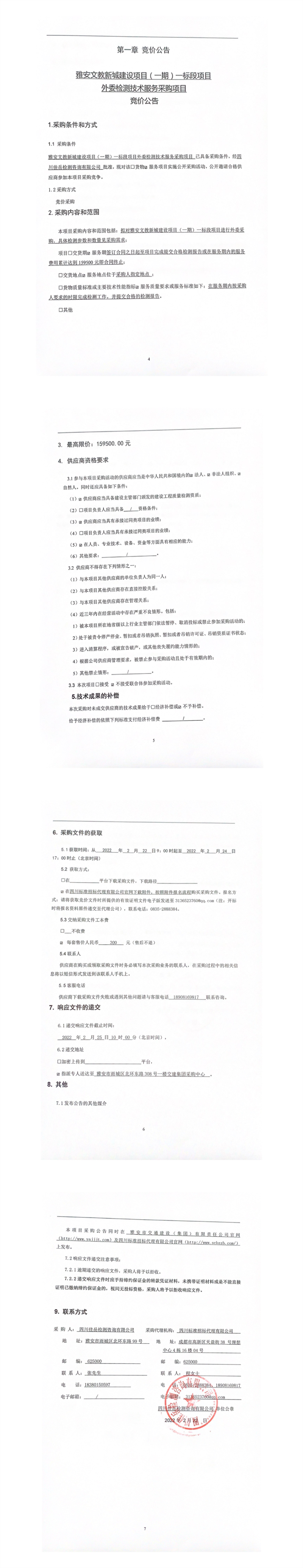 四川佳岳檢測咨詢有限公司雅安文教新城建設(shè)項(xiàng)目(一期)一標(biāo)段項(xiàng)目外委檢測技術(shù)服務(wù)采購項(xiàng)目競價(jià)公告