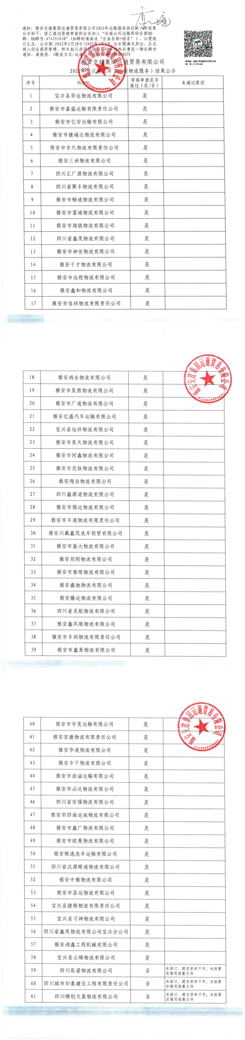 雅安交建集團運通貿(mào)易有限公司2022年供應商入庫(運輸物流服務)結(jié)果公示