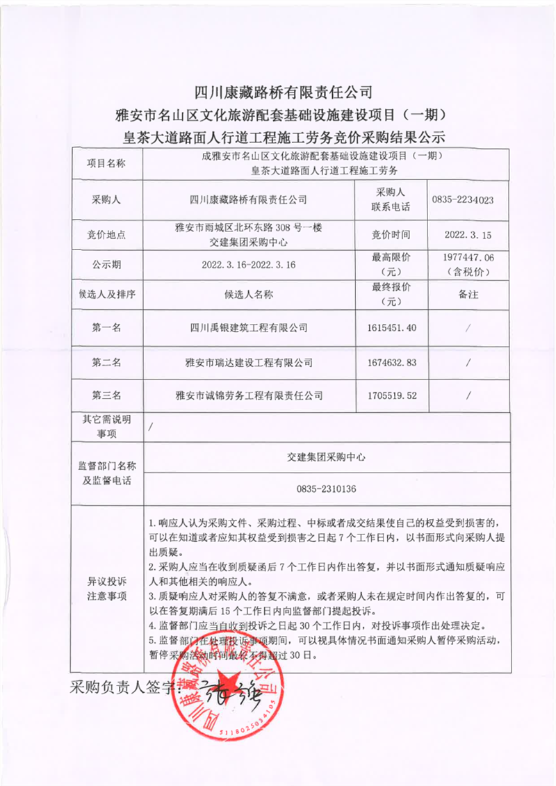 四川康藏路橋有限責(zé)任公司雅安市名山區(qū)文化旅游配套基礎(chǔ)設(shè)施建設(shè)項目(一期)皇茶大道路面人行道工程施工勞務(wù)競價采購結(jié)果公示
