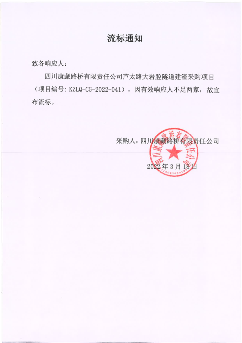四川康藏路橋有限責(zé)任公司蘆太路大巖腔隧道建渣采購項目流標通知