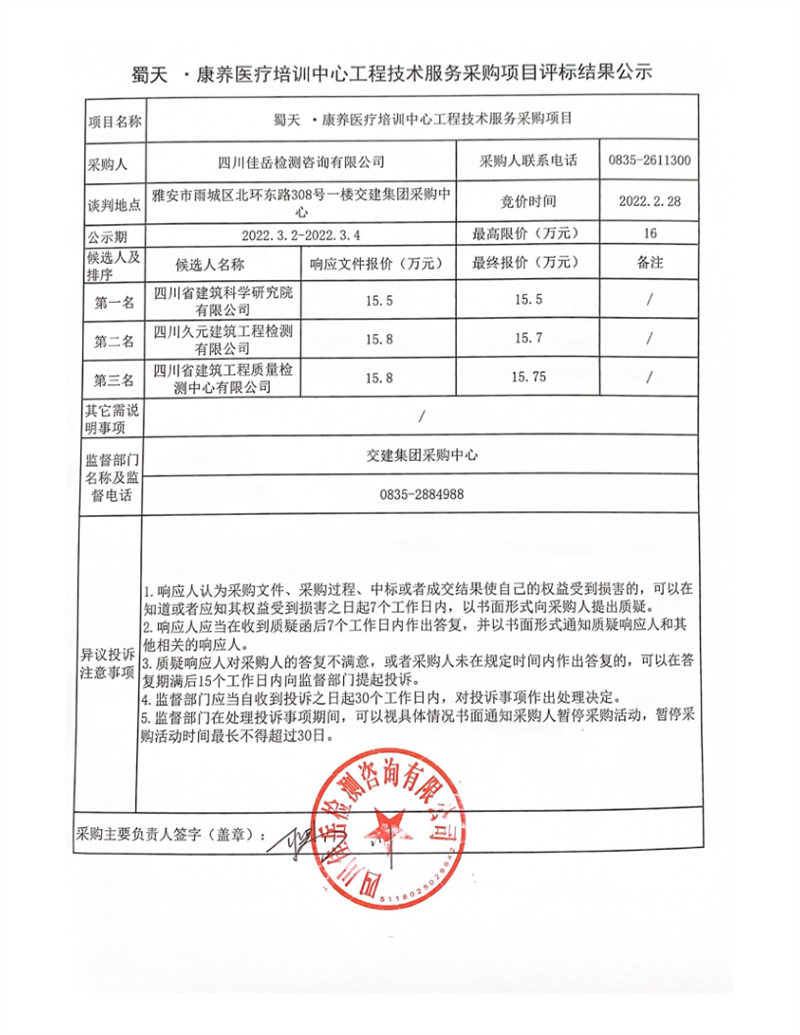四川佳岳檢測咨詢有限公司蜀天.康養(yǎng)醫(yī)療培訓(xùn)中心工程技術(shù)服務(wù)采購項目評標(biāo)結(jié)果公示