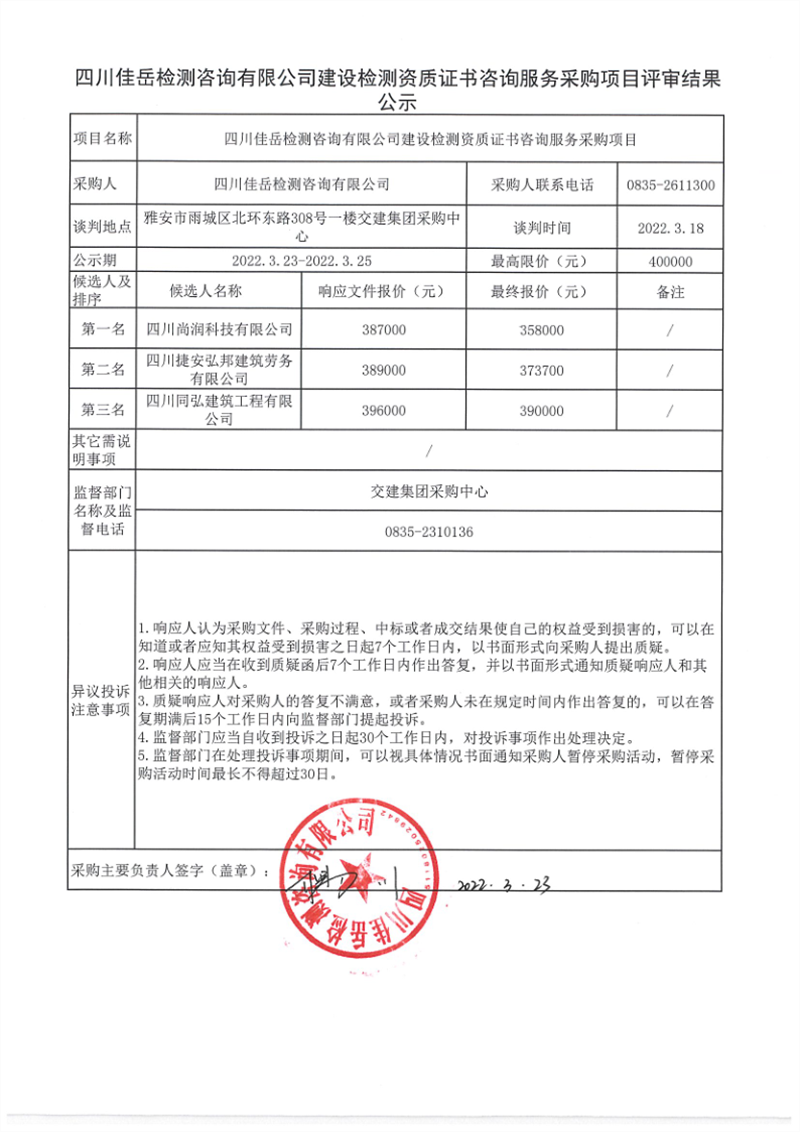 四川佳岳檢測咨詢有限公司建設(shè)檢測資質(zhì)證書咨詢服務(wù)采購項目評審結(jié)果公示