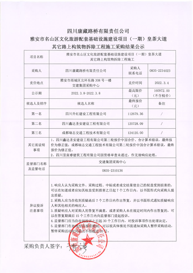 四川康藏路橋有限責(zé)任公司雅安市名山區(qū)文化旅游配套基礎(chǔ)設(shè)施建設(shè)項(xiàng)目(一期)皇茶大道其它路上構(gòu)筑物拆除工程施工采購結(jié)果公示