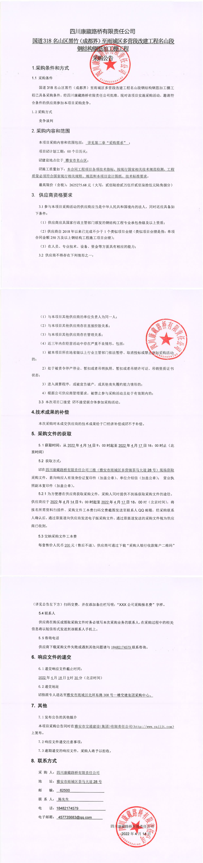 四川康藏路橋有限責(zé)任公司國(guó)道318名山區(qū)黑竹(成都界)至雨城區(qū)多營(yíng)段改建工程名山段鋼結(jié)構(gòu)鋼筋加工棚工程采購(gòu)公告