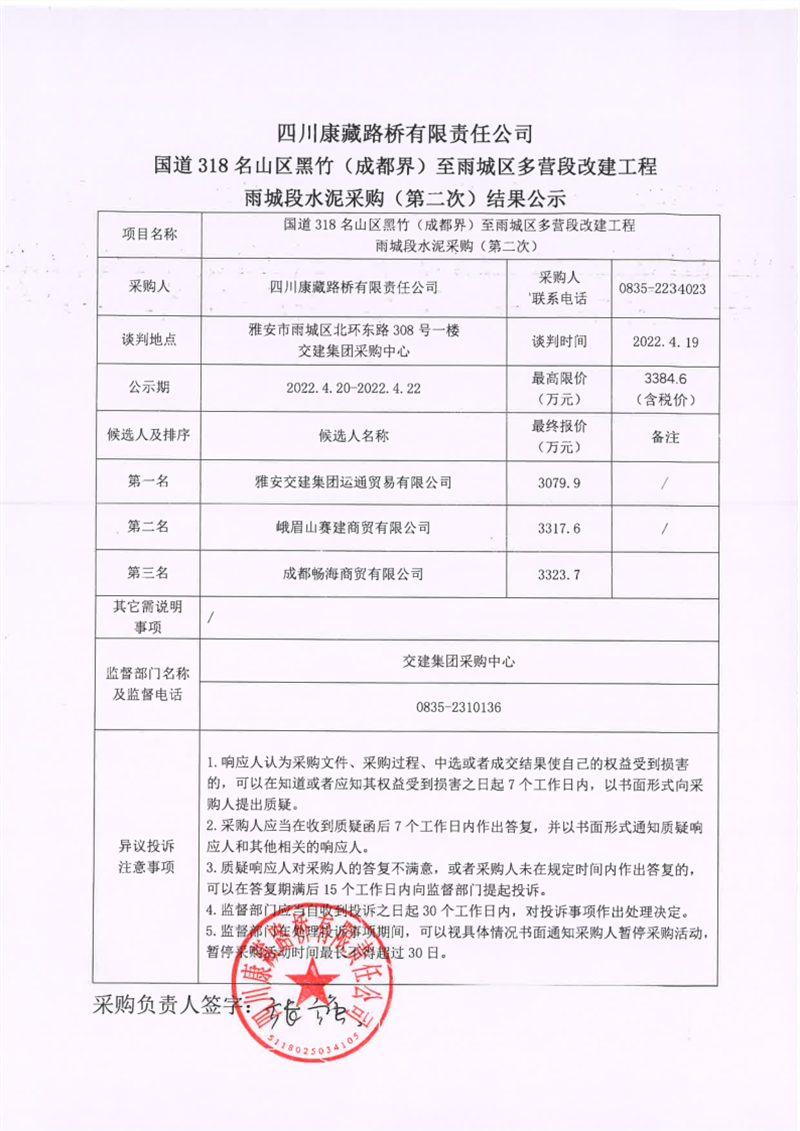 四川康藏路橋有限責任公司國道318名山區(qū)黑竹(成都界)至雨城區(qū)多營段改建工程雨城段水泥采購(第二次)結(jié)果公示