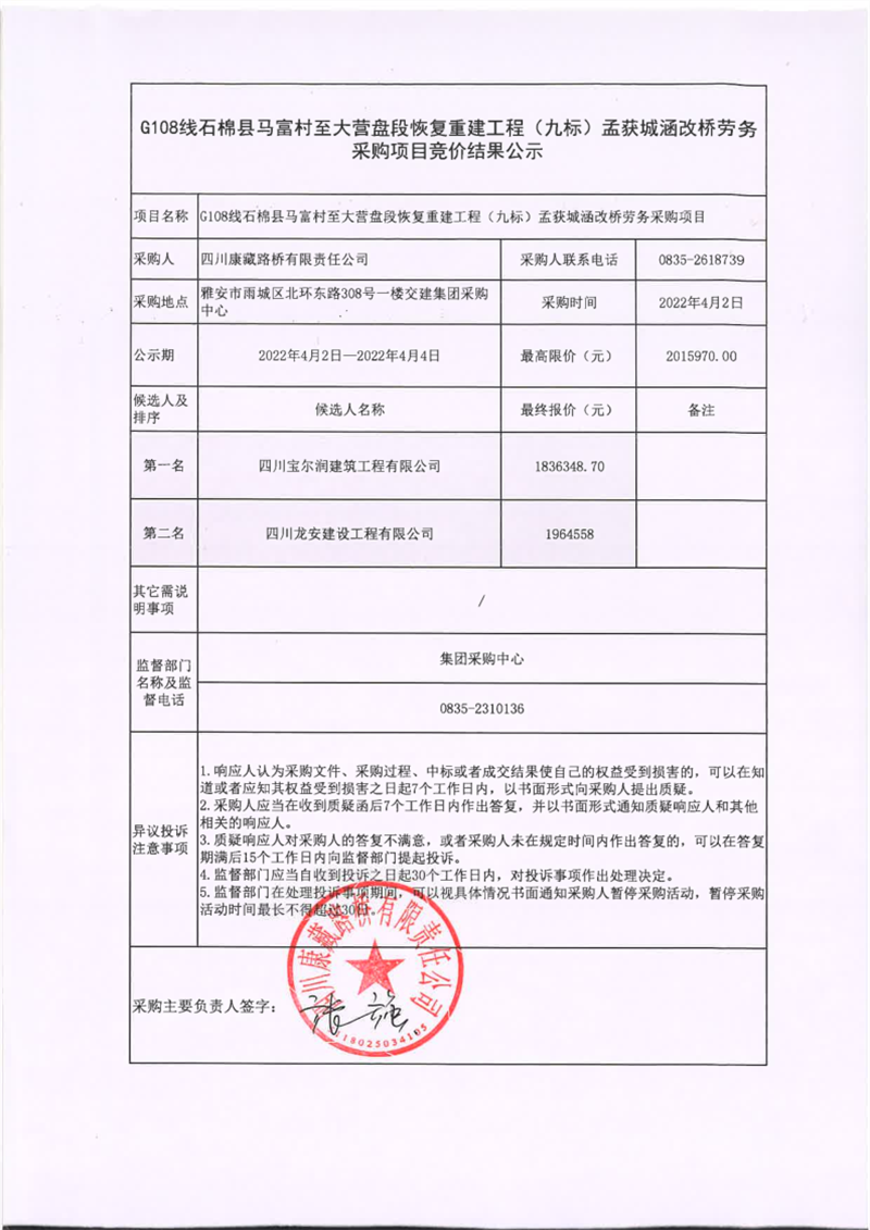 四川康藏路橋有限責任公司G108線石棉縣馬富村至大營盤段恢復重建工程(九標)孟獲城涵改橋勞務采購項目競價結(jié)果公示