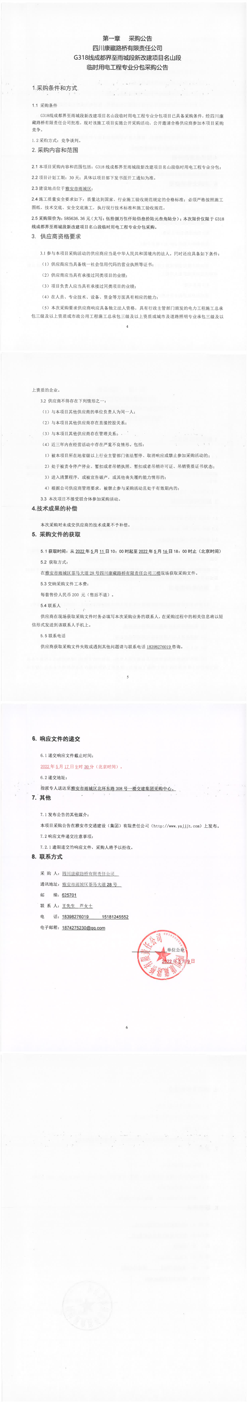 四川康藏路橋有限責(zé)任公司G318線成都界至雨城段新改建項(xiàng)目名山段臨時(shí)用電工程專(zhuān)業(yè)分包采購(gòu)公告