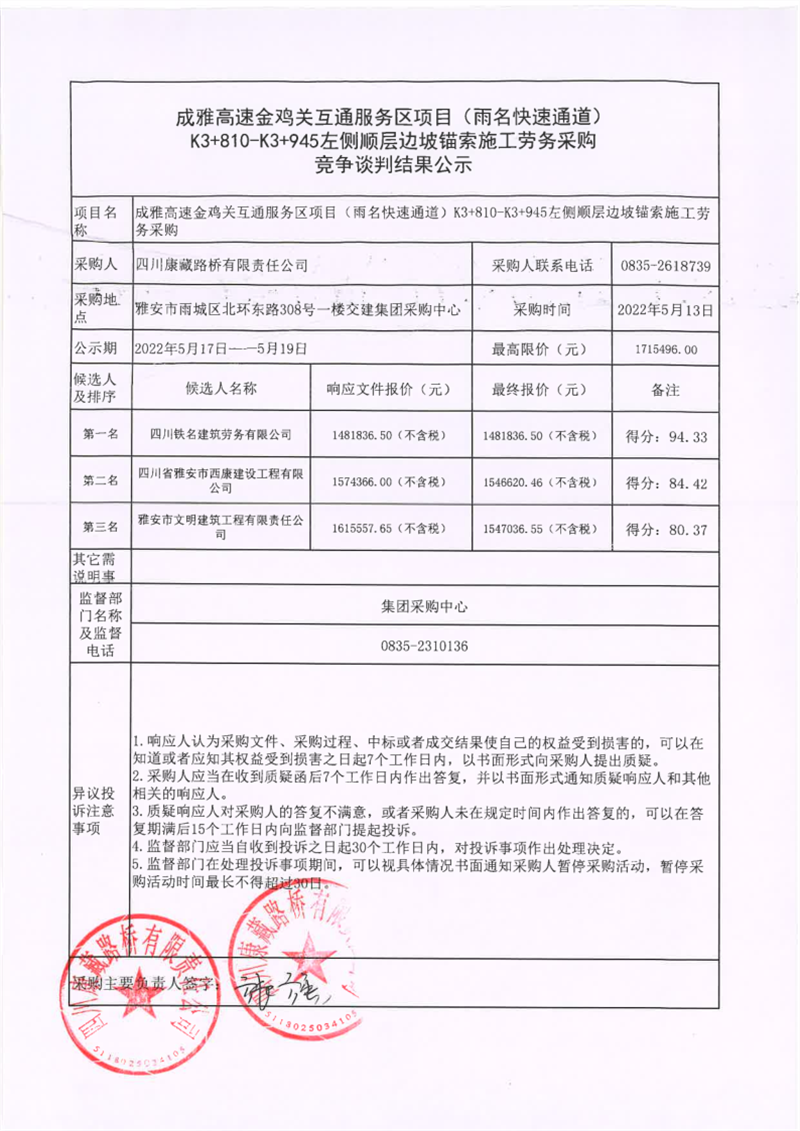 四川康藏路橋有限責(zé)任公司成雅高速金雞關(guān)互通服務(wù)區(qū)項目(雨名快速通道)K3+810-K3+945左側(cè)順層邊坡錨索施工勞務(wù)采購競爭談判結(jié)果公示