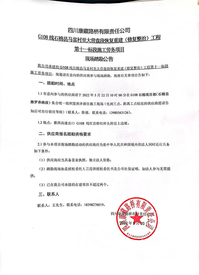 四川康藏路橋有限責(zé)任公司G108線石棉縣馬福村至大營盤段恢復(fù)重建(修復(fù)整治)工程第十一標段施工勞務(wù)項目現(xiàn)場踏勘公告