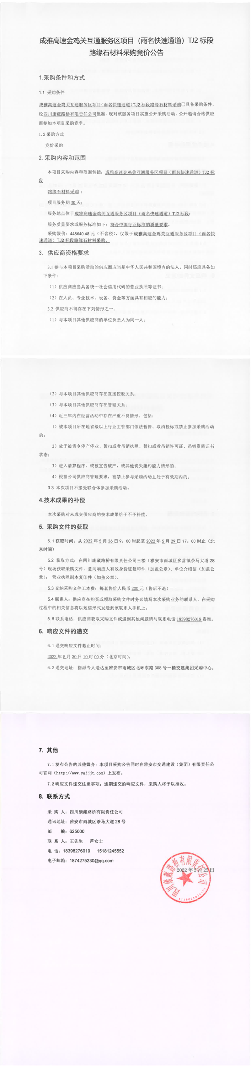 四川康藏路橋有限責(zé)任公司成雅高速金雞關(guān)互通服務(wù)區(qū)項(xiàng)目(雨名快速通道)TJ2標(biāo)段路緣石材料采購(gòu)競(jìng)價(jià)公告