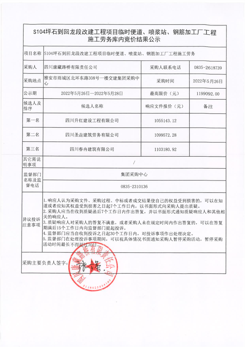 四川康藏路橋有限責(zé)任公司S104坪石到回龍改建工程項(xiàng)目臨時(shí)便道、噴漿站、鋼筋加工廠工程施工勞務(wù)庫內(nèi)競(jìng)價(jià)結(jié)果公示