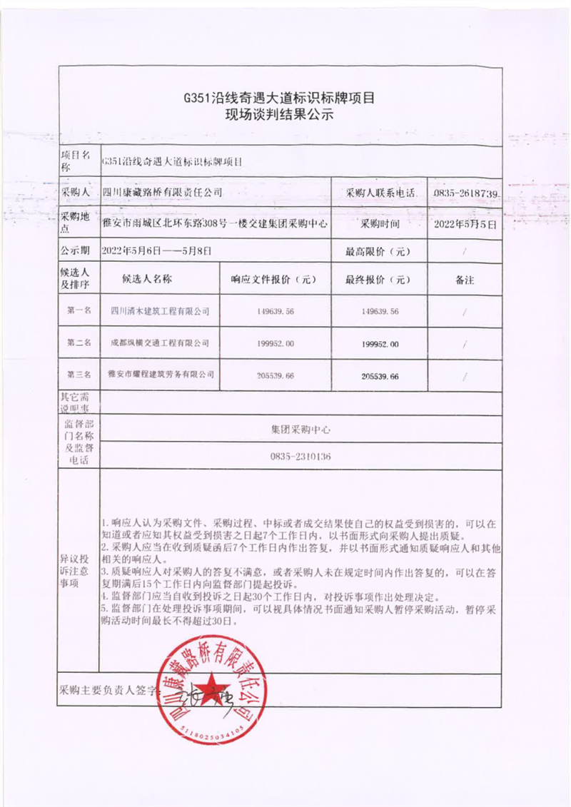 四川康藏路橋有限責(zé)任公司G351沿線奇遇大道標(biāo)識標(biāo)牌項(xiàng)目現(xiàn)場談判結(jié)果公示